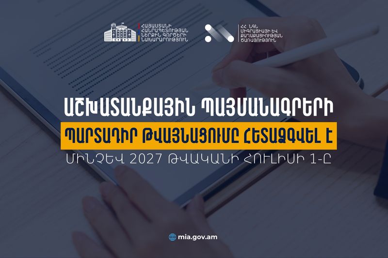 Աշխատանքային օրենսգրքի նոր փոփոխությամբ՝ աշխատանքային պայմանագրերի կնքումը, փոփոխումը և լուծումը բացառապես թվային համակարգով իրականացնելու պահանջը տեղափոխվել է 2027 թ. հուլիսի 1։