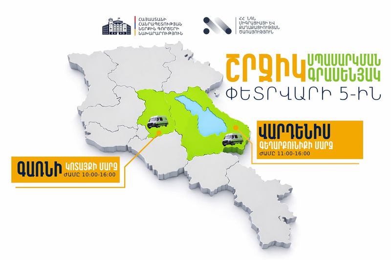 Փետրվարի 5-ին շրջիկ սպասարկման գրասենյակները կլինեն նաև Կոտայքի մարզի Բյուրեղավան և Արարատի մարզի Արարատ համայնքներում՝ հունվարի 30-ին ընդունված դիմումների շրջանակներում փաստաթղթերը հանձնելու նպատակով։